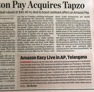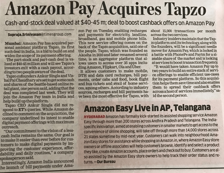 Amazon guys think really long term and hence the compounding effect of those 3 years worth of time savings was sufficiently large. Launch these categories within 6-8 months, and the additional share of customer wallet (transacting on Amazon Pay, rather than on competitors) + cross benefit to the shopping flywheel (what really matters to Amazon) was compelling enough for them to make an offer for Tapzo.