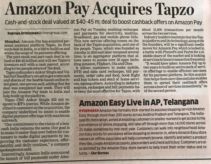 Amazon guys think really long term and hence the compounding effect of those 3 years worth of time savings was sufficiently large. Launch these categories within 6-8 months, and the additional share of customer wallet (transacting on Amazon Pay, rather than on competitors) + cross benefit to the shopping flywheel (what really matters to Amazon) was compelling enough for them to make an offer for Tapzo.